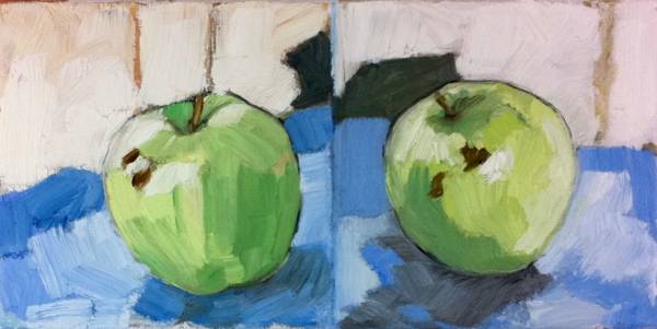 A few days ago I found a challenge on dailypaintworks I thought I might try. The exercise was to take an object and make a series of 10-minute paintings of it on the same canvas. I had an apple and a blue cloth so I was in business. After ten minutes, though, I’d barely got started, so I dropped the time limit and just went for it. Each side took me somewhere around 45 minutes. Fun.